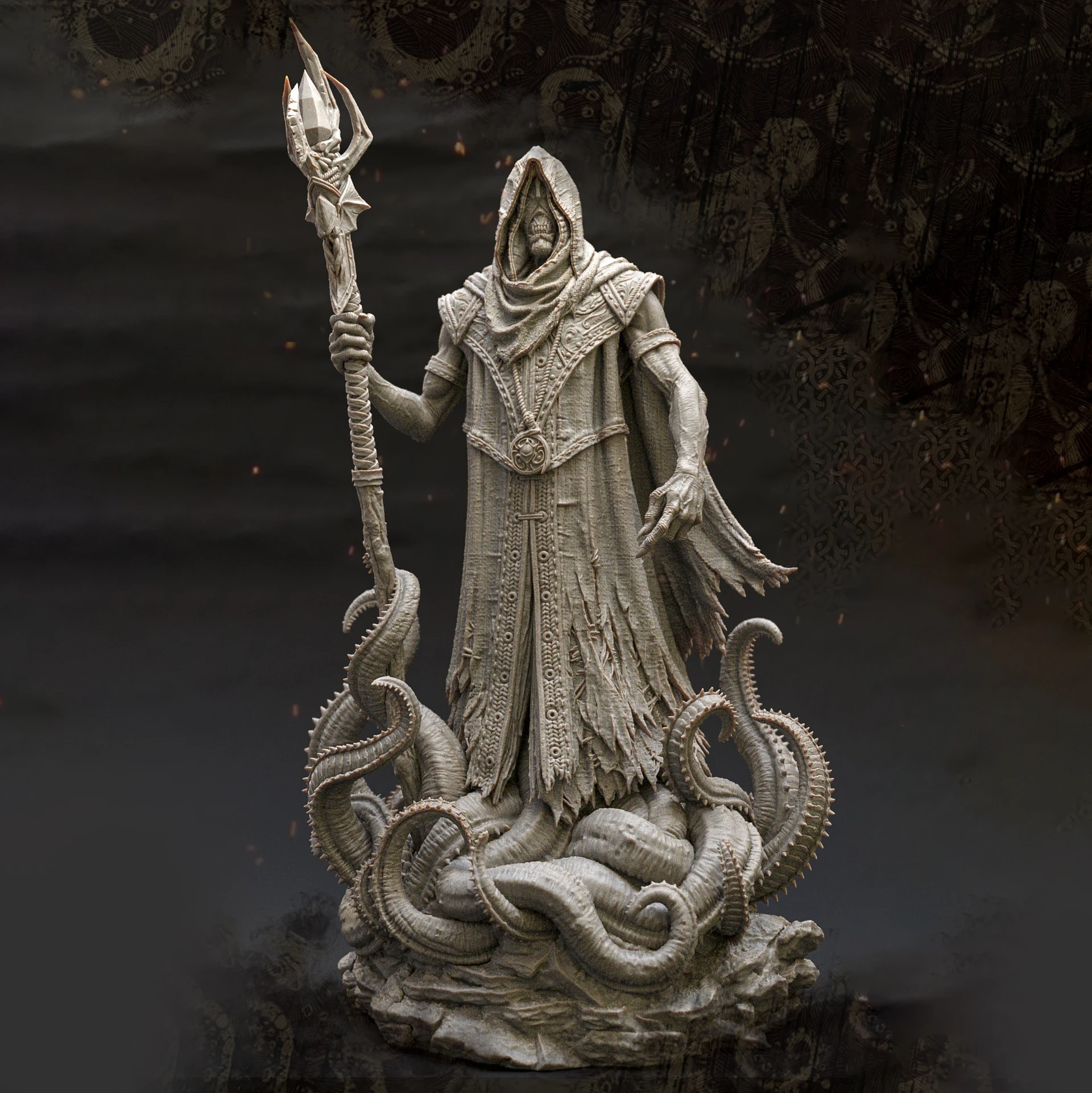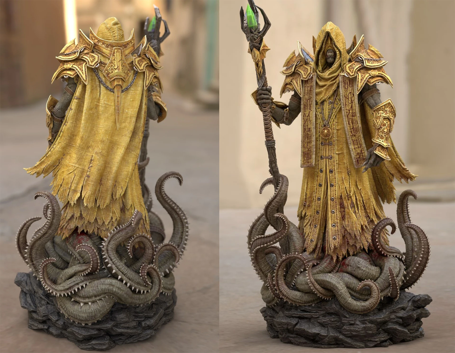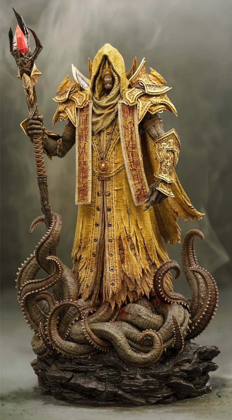 Based on the ingame model I created of the King in Yellow / Hastur, I decided to design a 3D-printable version of the character. For this version, I adjusted the design, refined the pose, and focused on adding more intricate details.The model was divided into several parts to increase the overall size of the figure and make painting easier. This also allowed me to create additional variations of the model, such as an attachment holding the Necronomicon, a version without armor, or one with wings. One of my main goals was to split the model in a way that keeps the seams invisible after assembly, without requiring extensive post-processing.