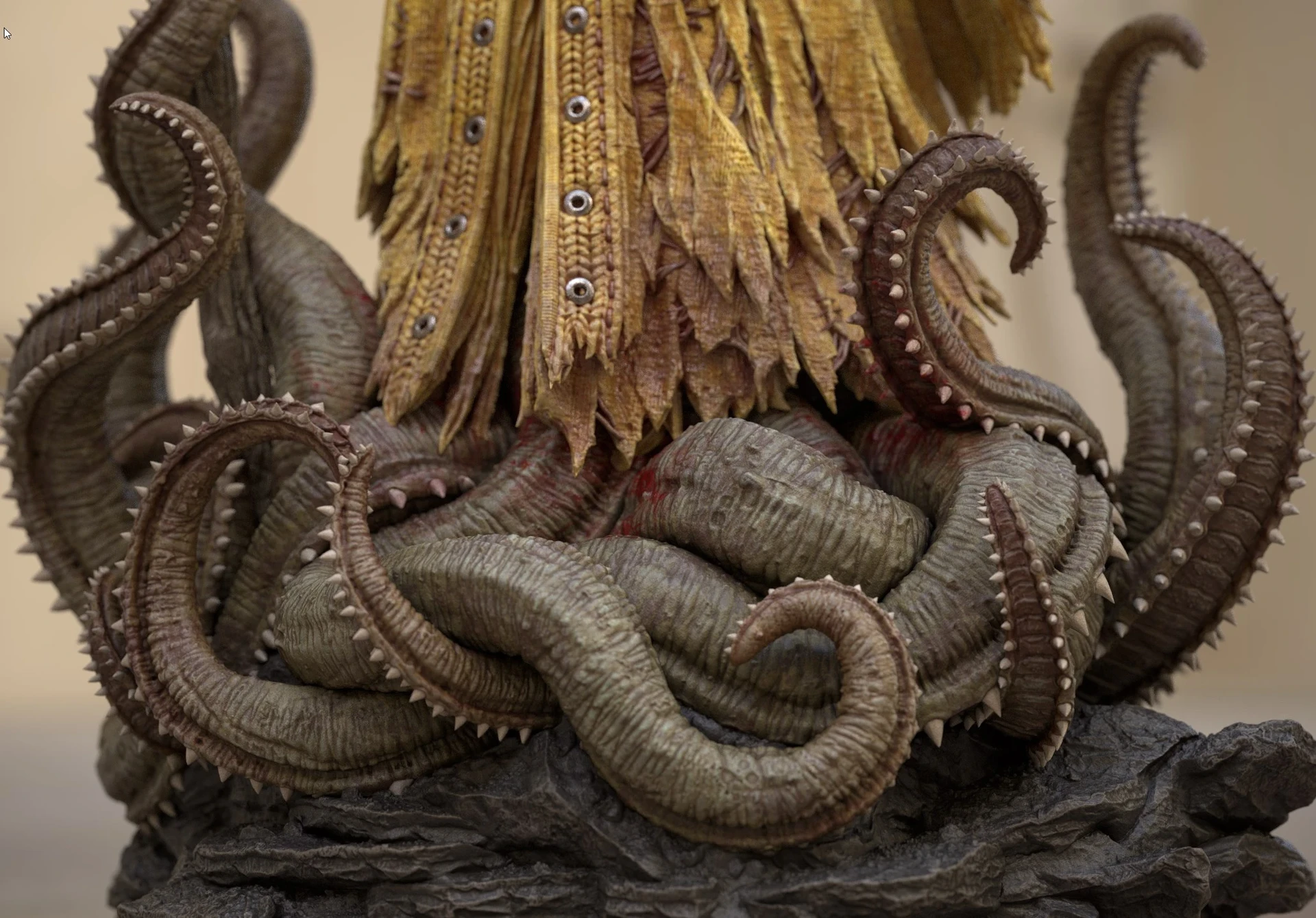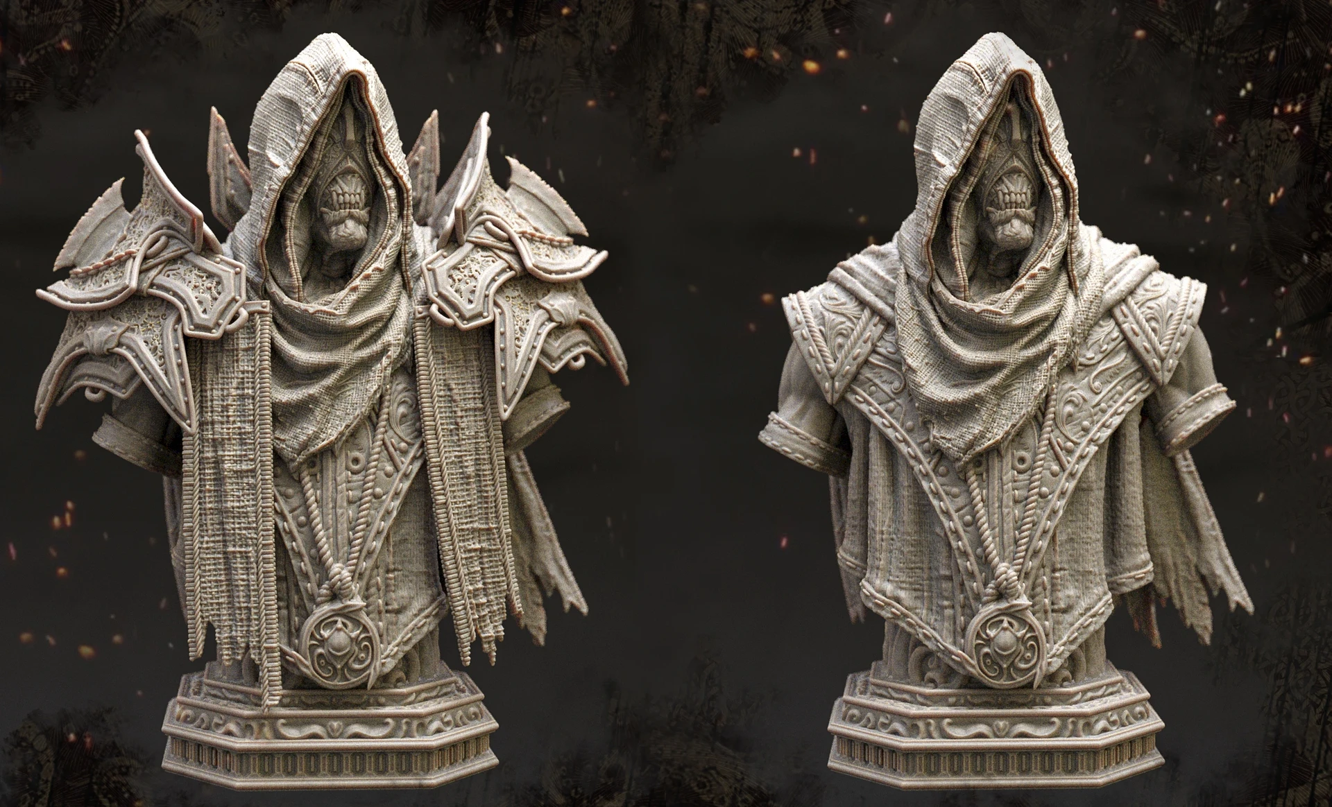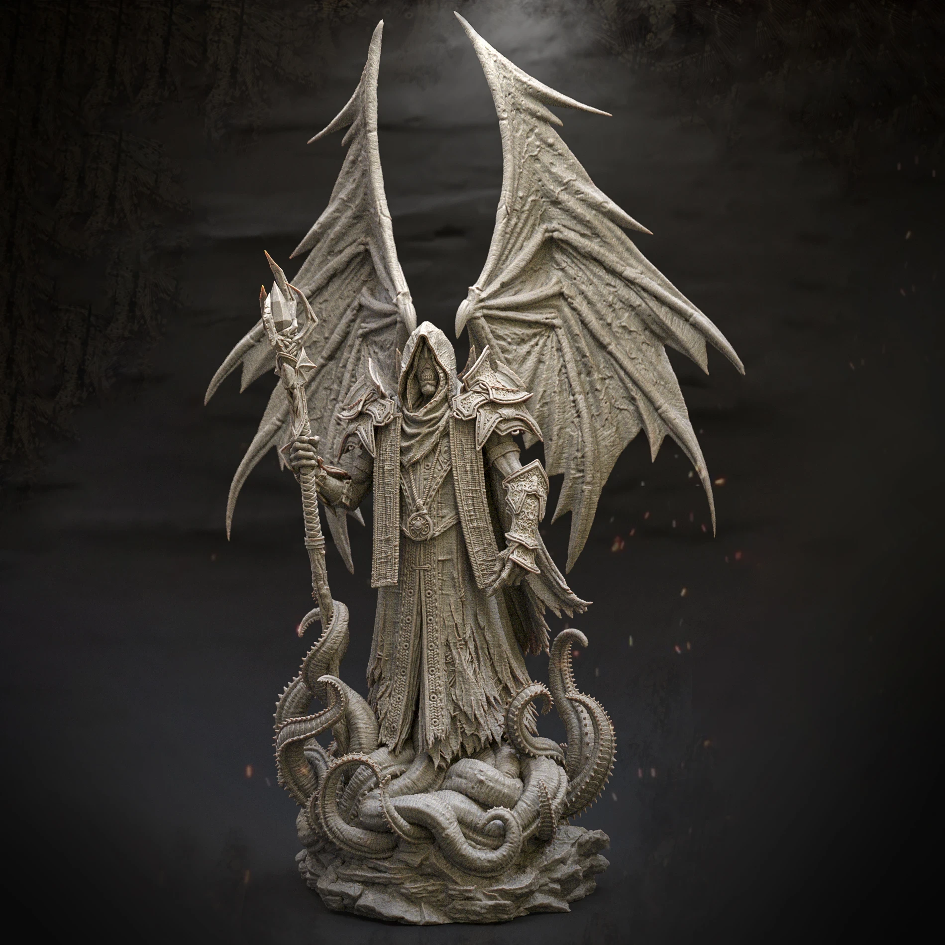 Based on the ingame model I created of the King in Yellow / Hastur, I decided to design a 3D-printable version of the character. For this version, I adjusted the design, refined the pose, and focused on adding more intricate details.The model was divided into several parts to increase the overall size of the figure and make painting easier. This also allowed me to create additional variations of the model, such as an attachment holding the Necronomicon, a version without armor, or one with wings. One of my main goals was to split the model in a way that keeps the seams invisible after assembly, without requiring extensive post-processing.