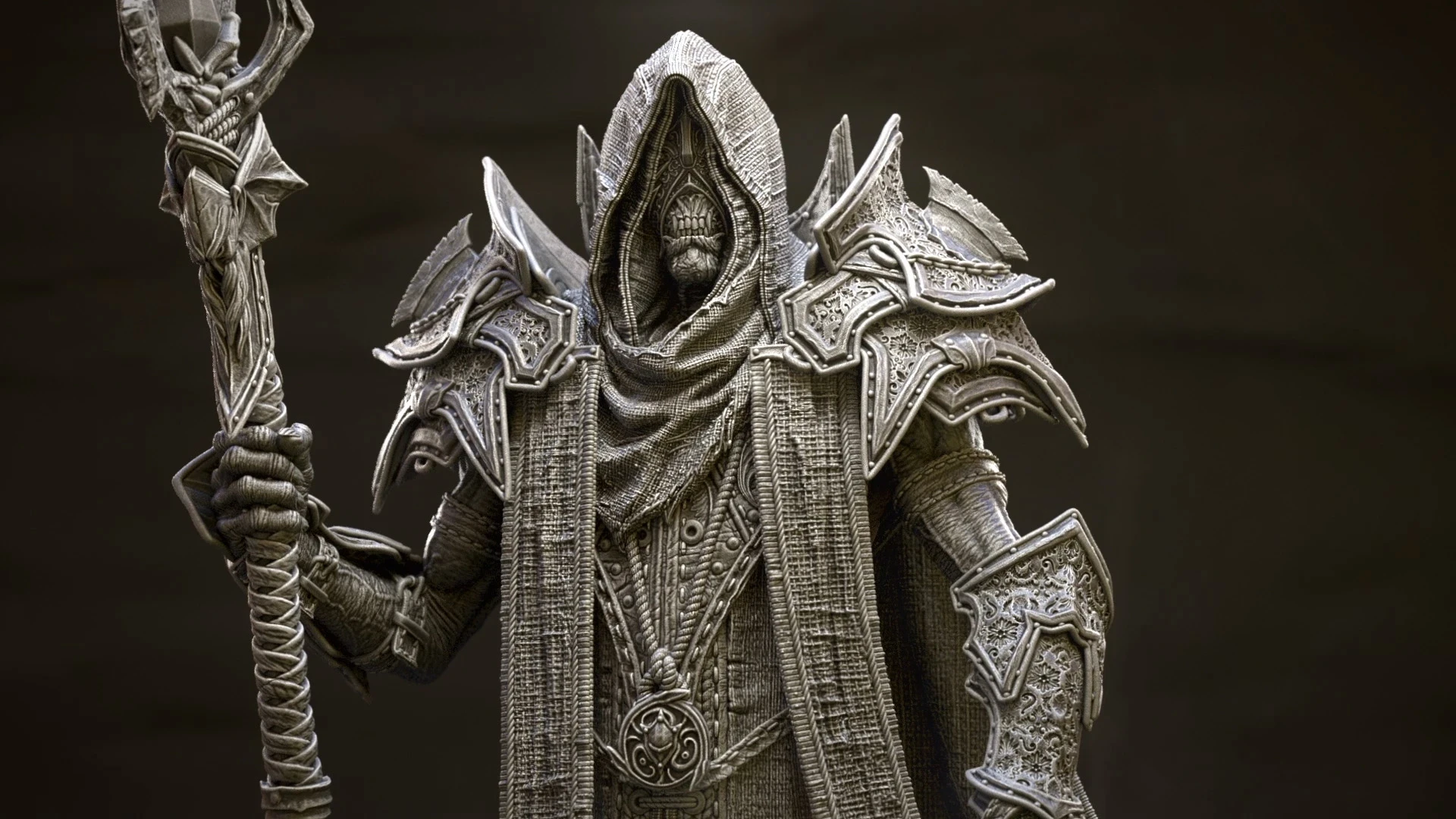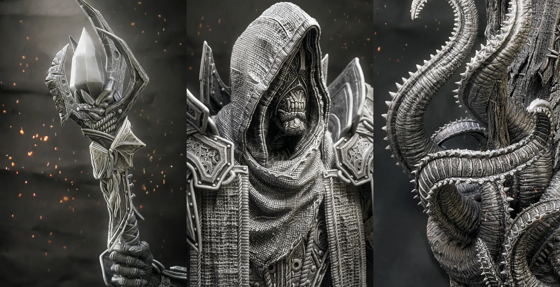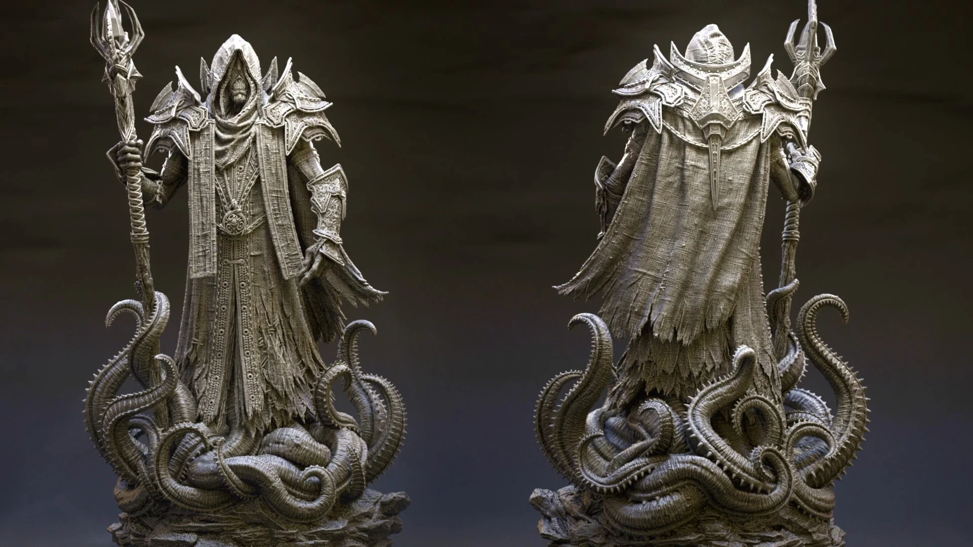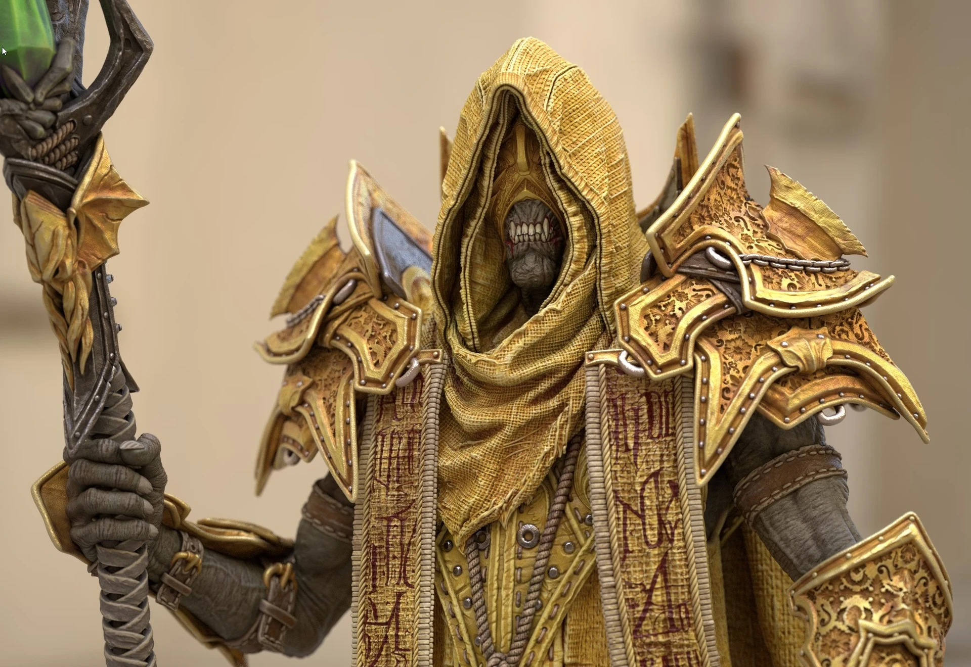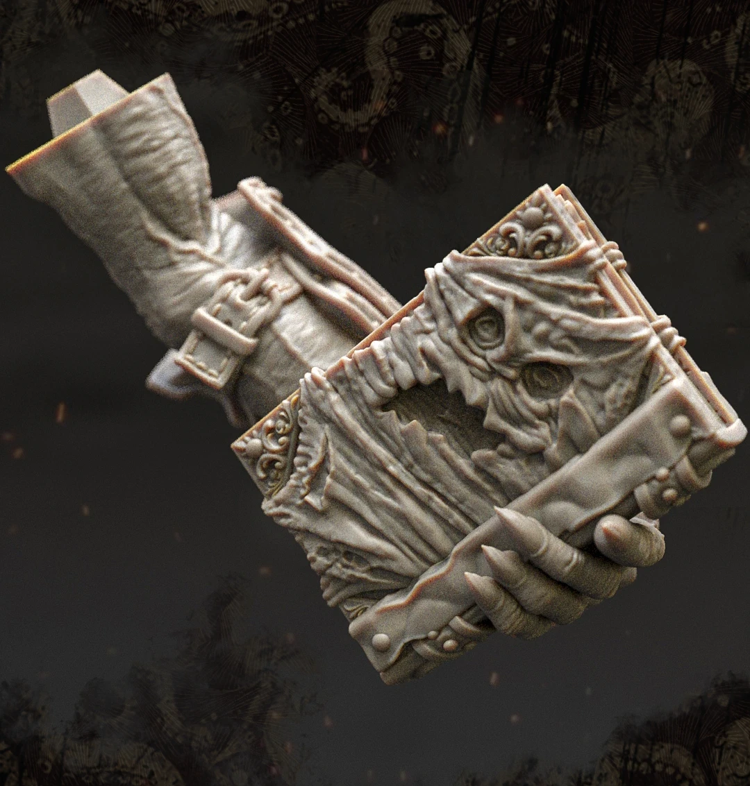 Based on the ingame model I created of the King in Yellow / Hastur, I decided to design a 3D-printable version of the character. For this version, I adjusted the design, refined the pose, and focused on adding more intricate details.The model was divided into several parts to increase the overall size of the figure and make painting easier. This also allowed me to create additional variations of the model, such as an attachment holding the Necronomicon, a version without armor, or one with wings. One of my main goals was to split the model in a way that keeps the seams invisible after assembly, without requiring extensive post-processing.